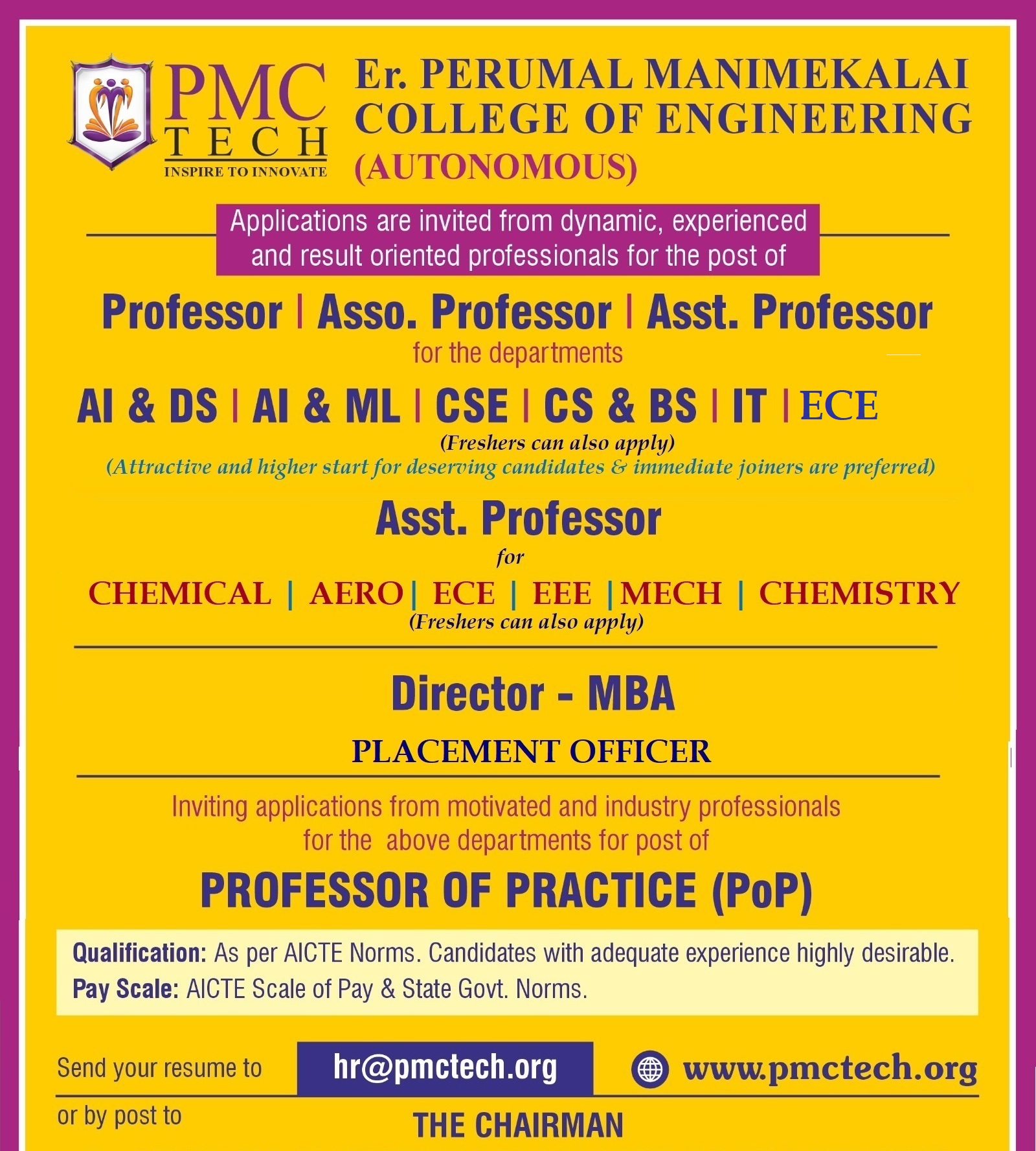 Er. Perumal Manimekalai College of Engineering (Autonomous) (Established in 2002), approved by AICTE, New Delhi and affiliated to Anna University, Chennai is accredited by NBA (CSE, ECE, EEE, IT & MECH) and accredited by NAAC with ‘A’ Grade. Institution has several ongoing innovative practices aimed to enhance the students’ skills through outcome-based educational practices, training, research, innovation and entrepreneurship.