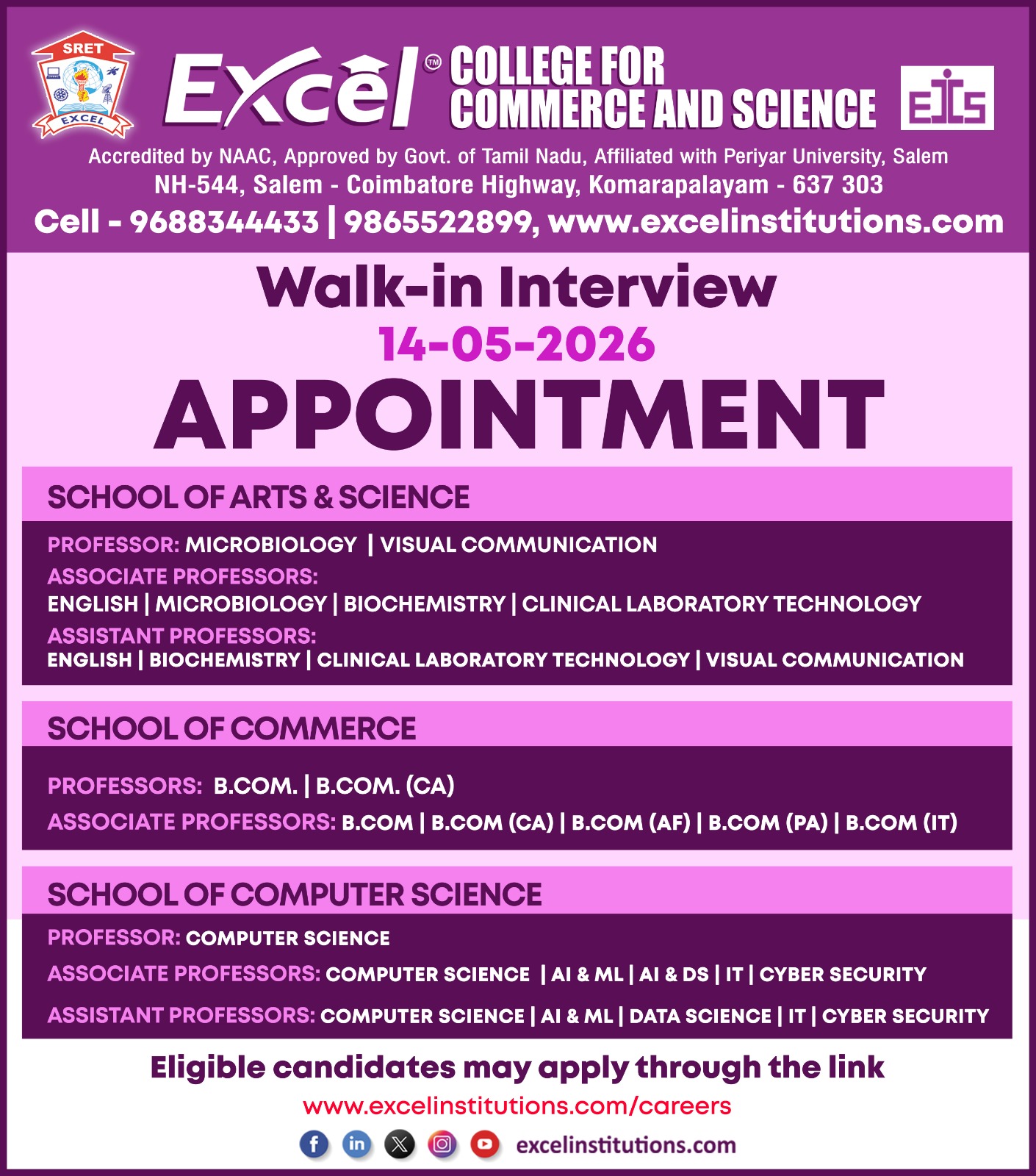 Academic career opportunities are now open at Excel Group Institutions, Tamil Nadu – rewarding openings for Professors, Associate Professors, and Assistant Professors in Engineering, Architecture, Management, Arts & Science, Commerce, and Computer Science disciplines. The institutions invite applications from qualified candidates with strong academic credentials and teaching excellence. Eligible applicants are encouraged to attend the walk-in interview on 14th May 2026 and 15th May 2026 or apply online.