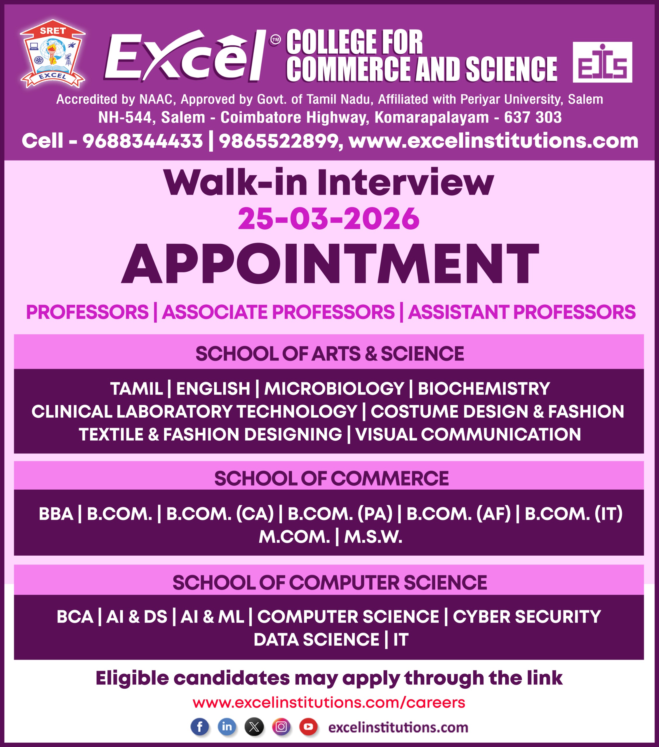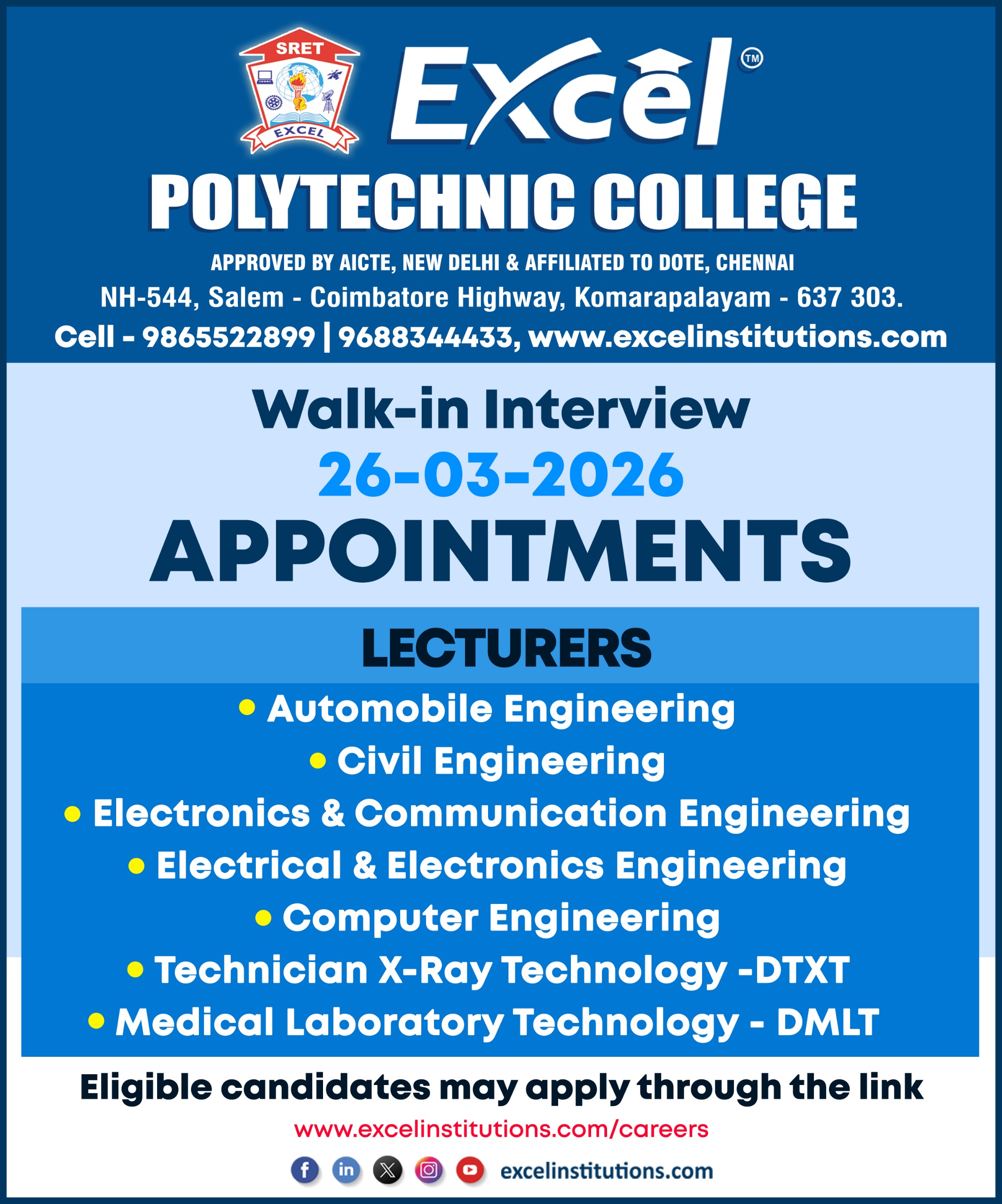 Excel Group of Instititons, Komarapalayam | Faculty Openings 2026