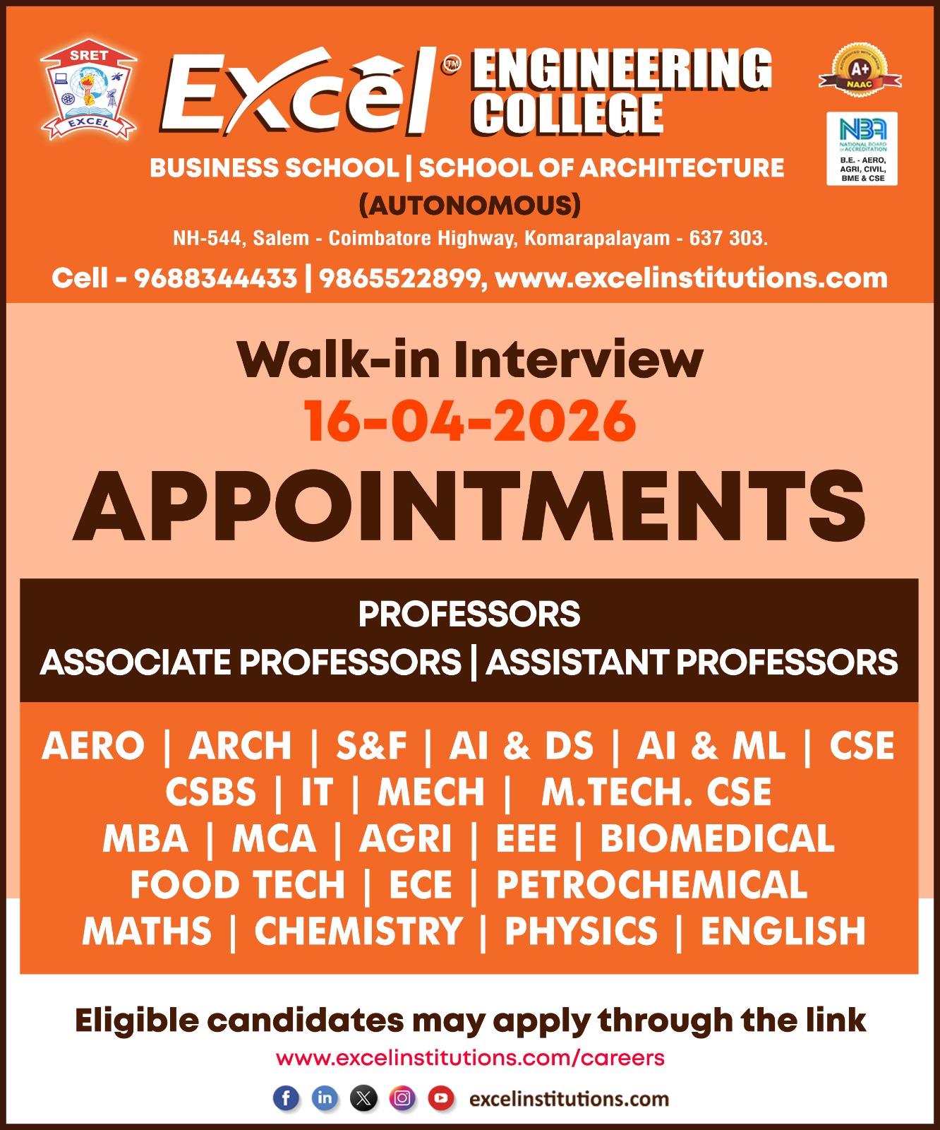 Excel Group of Institution (Engg and Commerce & Science) | Walk-in Interview