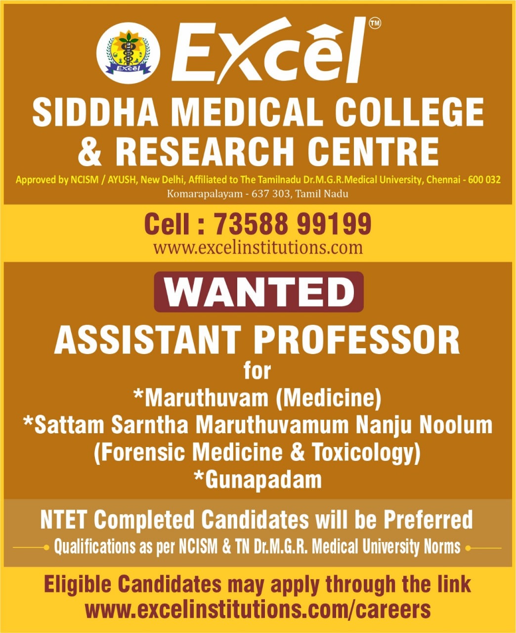 Excel Siddha Medical College and Research Centre, Namakkal, Tamilnadu Advertised Officially for the faculty recruitment 2025– Assistant Professor Jobs. Eligible candidates can apply online.