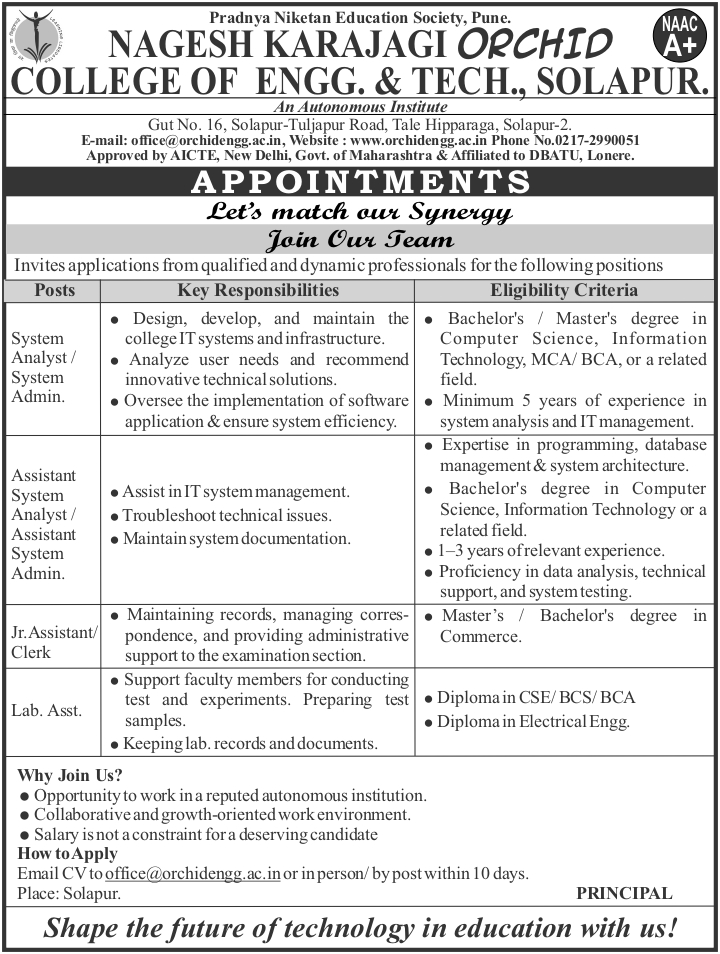 Teaching Jobs vacancy notification announced by N.K.Orchid College of Engineering and Technology, Solapur, Maharashtra for the 2025 academic year. Eligible candidates may apply through Email.