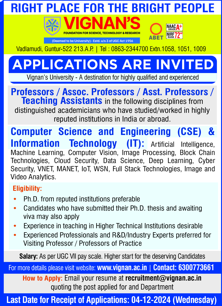 Faculty Openings 2025 at Vignan’s Foundation for Science, Technology & Research (VFSTR) 05_Applications Invited _ Teaching 8 x 11 cm (04-12-2024) copy (1)