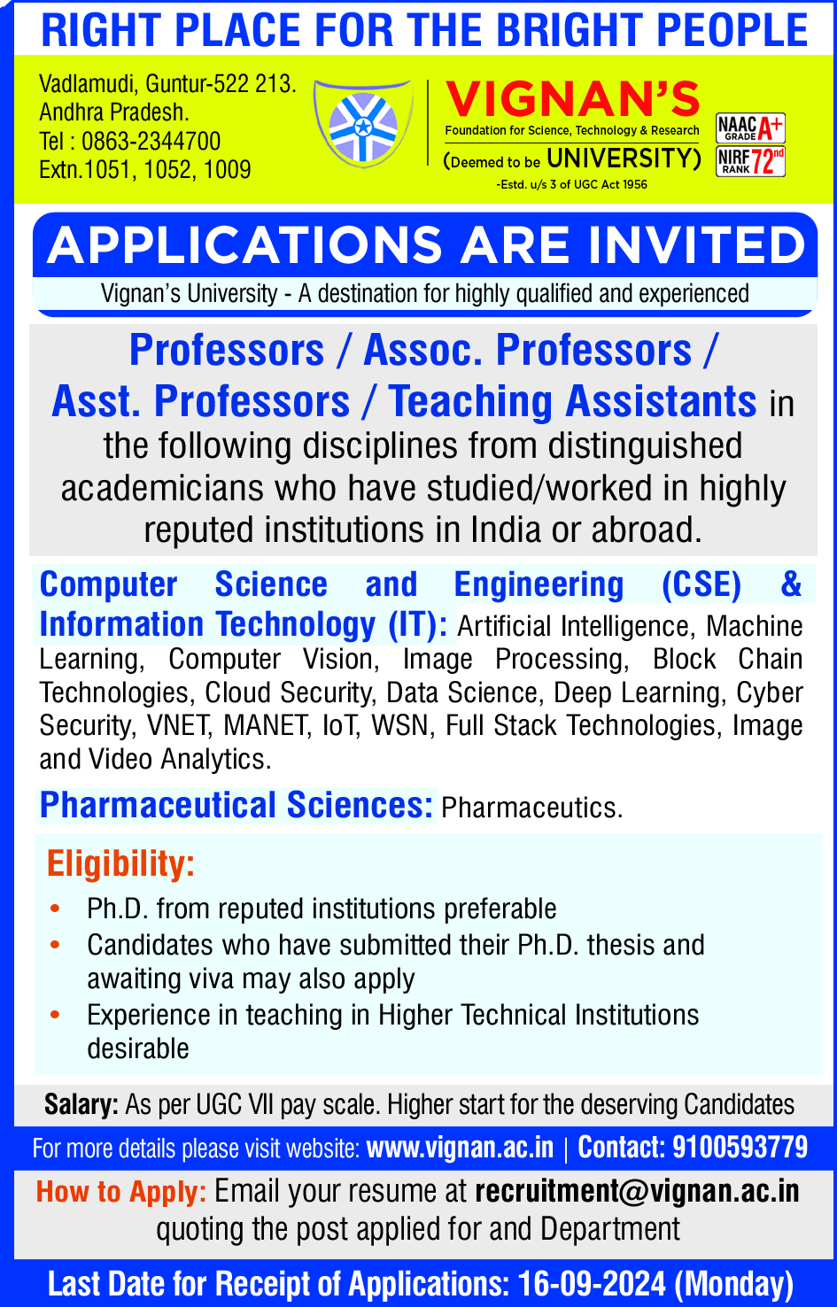 Faculty Openings 2025 at Vignan’s Foundation for Science, Technology & Research (VFSTR) Applications Invited _ Teaching 8 x 12 cm (3-09-2024) copy