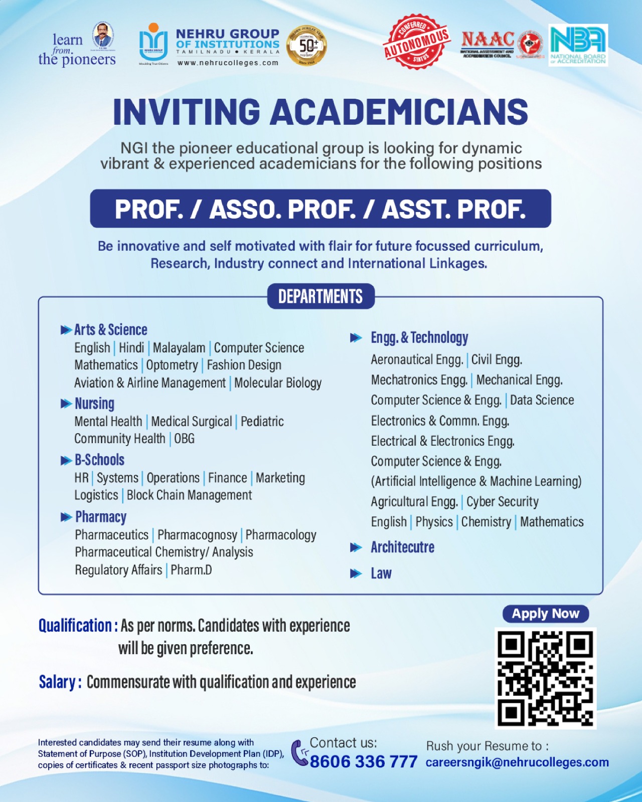 Hiring Organization: Nehru Group of Institutions (Tamil Nadu & Kerala)