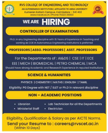 Faculty Recruitment 2025 notification announced by RVS college of Engineering and Technology (Autonomous), Coimbatore – Professor, Associate Professor & Assistant Professor. Eligible candidates may apply by email