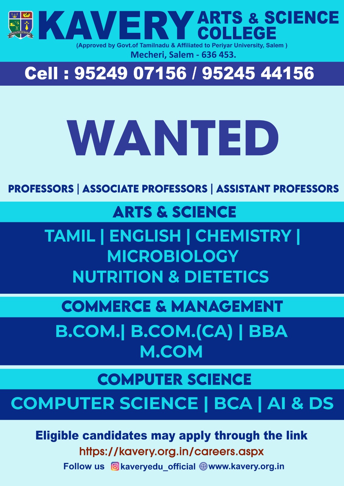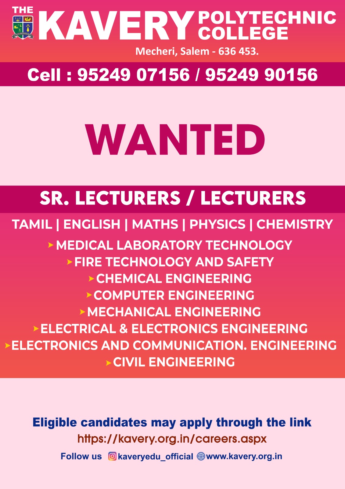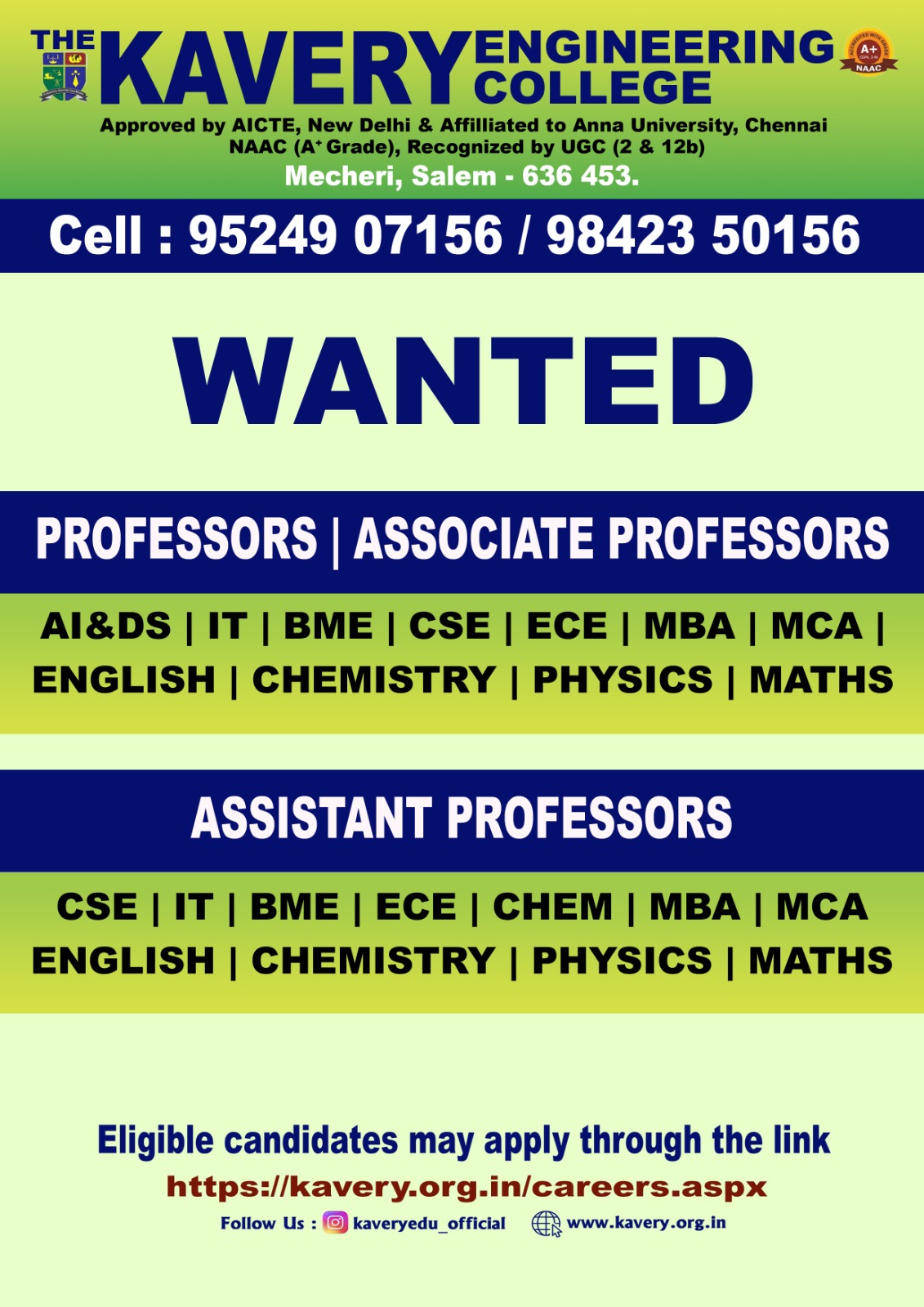 Kavery Group of Institutions offers a dynamic and growth-oriented academic environment for educators across various disciplines. Faculty members benefit from exposure to multidisciplinary teaching, modern infrastructure, and opportunities for professional development. The group encourages innovation, research, and academic collaboration, making it an ideal workplace for candidates seeking long-term career growth in education.