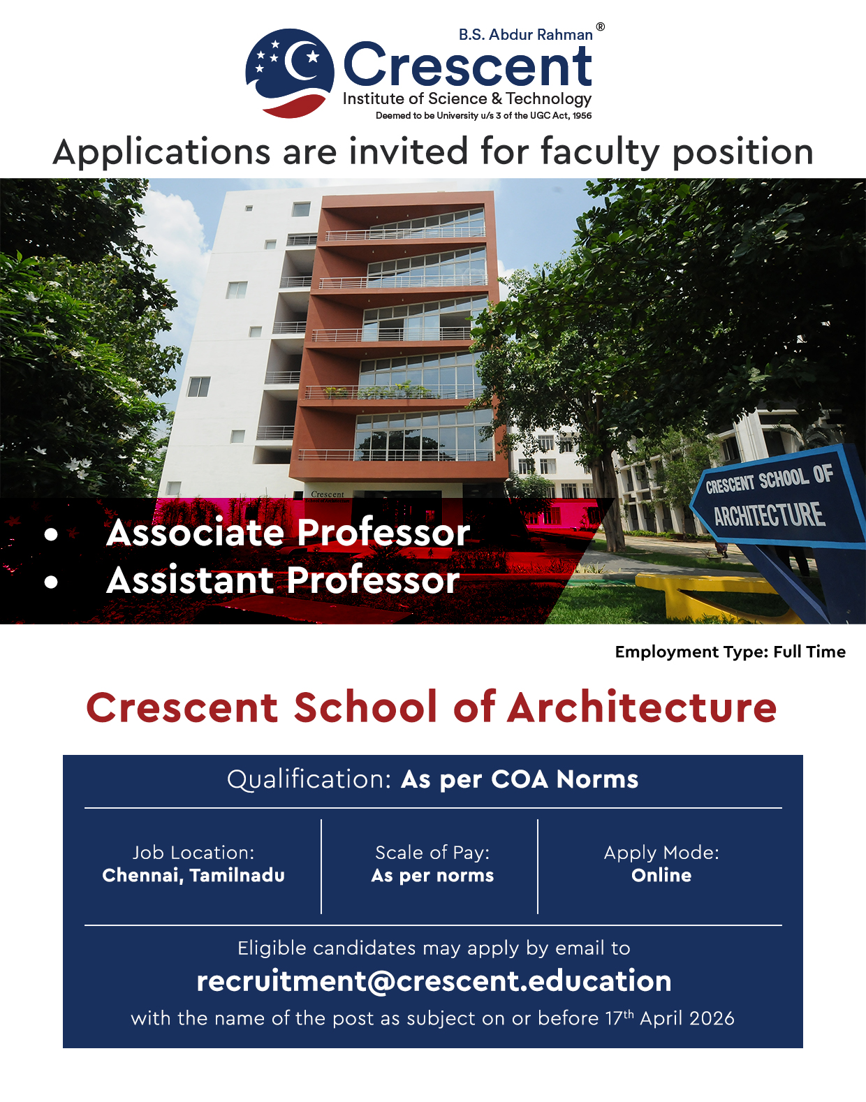 Crescent School of Architecture, Chennai, has invited applications for faculty positions for the academic year 2026. The institution is seeking qualified and passionate candidates for teaching roles in architecture. This opportunity is ideal for individuals who are committed to academic excellence, creative design education, and contributing to a reputed institution with a strong academic foundation.