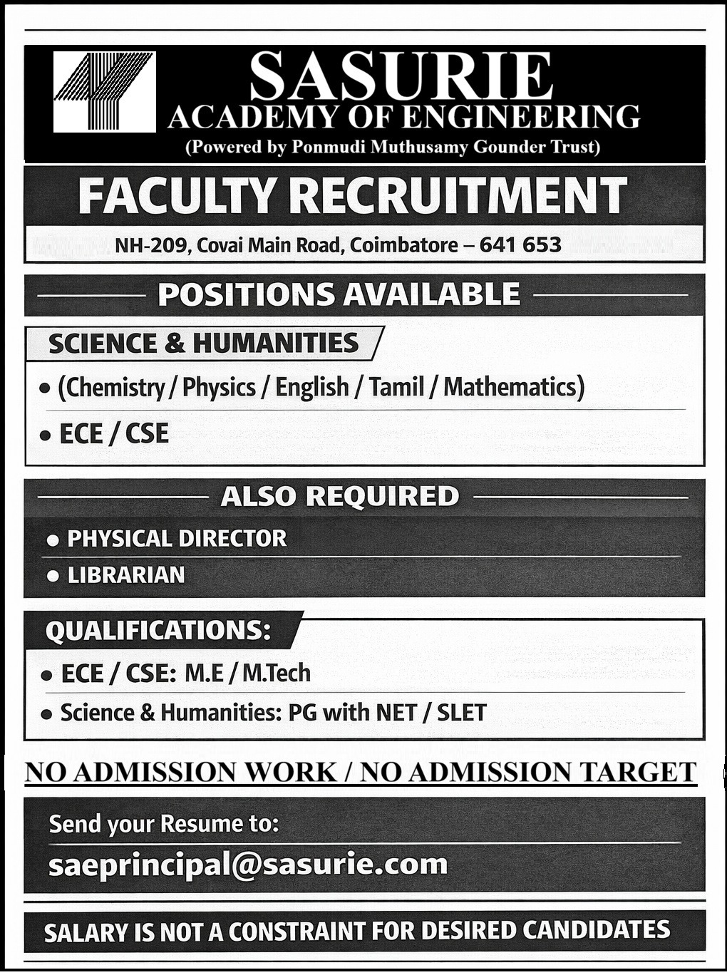 Sasurie Academy of Engineering, Coimbatore, has announced a faculty recruitment notification for the academic year 2026. The institution is inviting applications from qualified and dedicated candidates for teaching and supporting roles in engineering and science disciplines. This opportunity is ideal for individuals who are passionate about teaching, student development, and contributing to a professional academic environment.