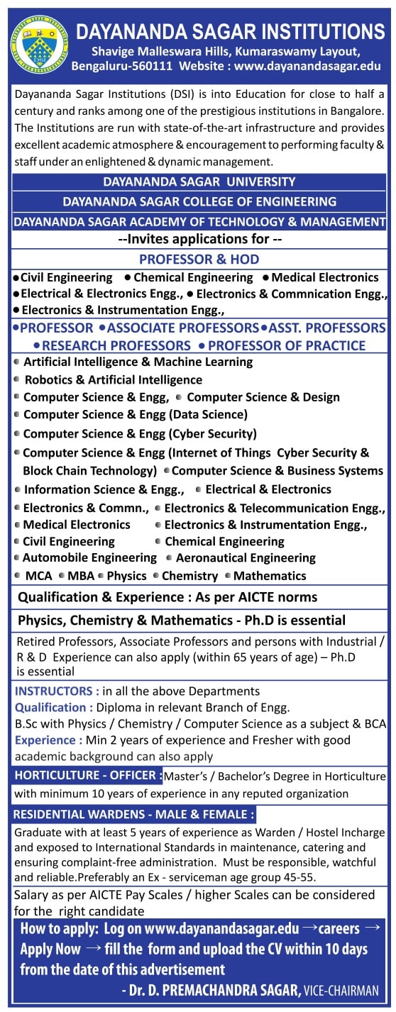 How to Apply: Log on www.dayanandasagar.edu —careers Apply Now —> fill the form and upload the CV within 10 days from the date of this advertisement