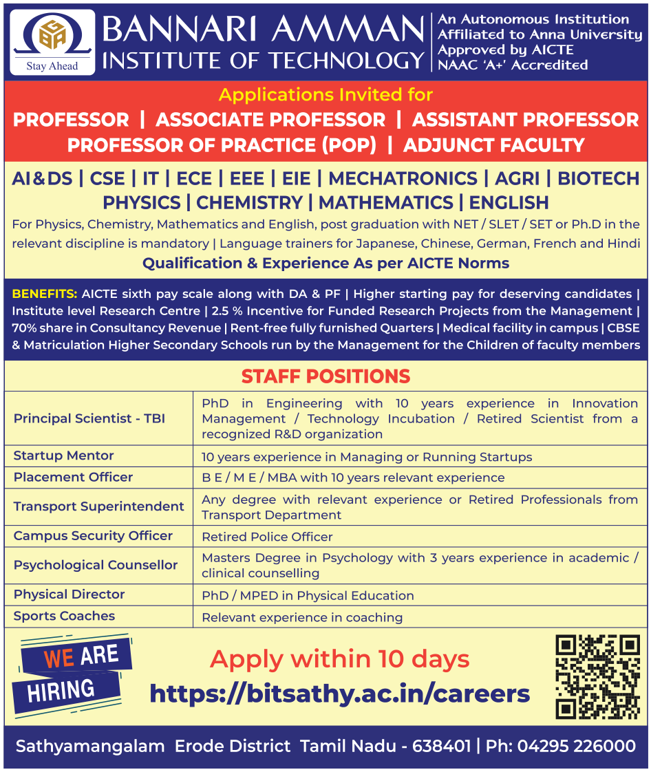 Link to Apply: https://www.bitsathy.ac.in/careers/