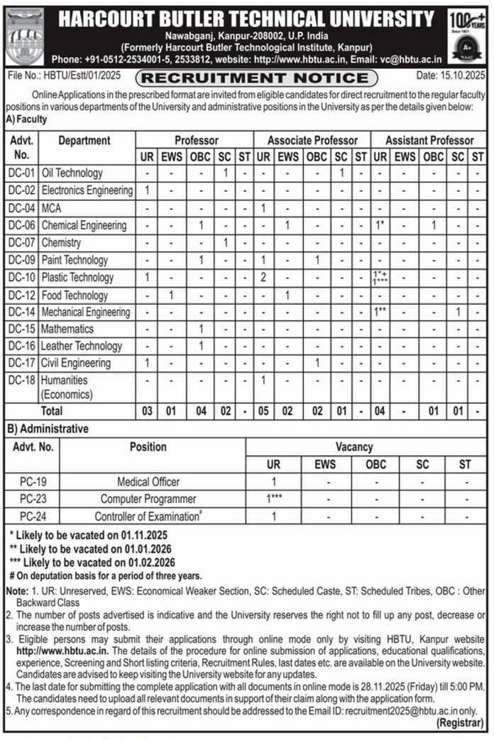How to Apply: Candidates are required to submit the application in online mode only by visiting HBTU, Kanpur website https://hbtu.ac.in/. The last date for submitting the complete application with all documents in online mode is 28.11.2025 (Friday) till 5:00 PM. The candidates need to upload all relevant documents in support of their claim along with the application form.