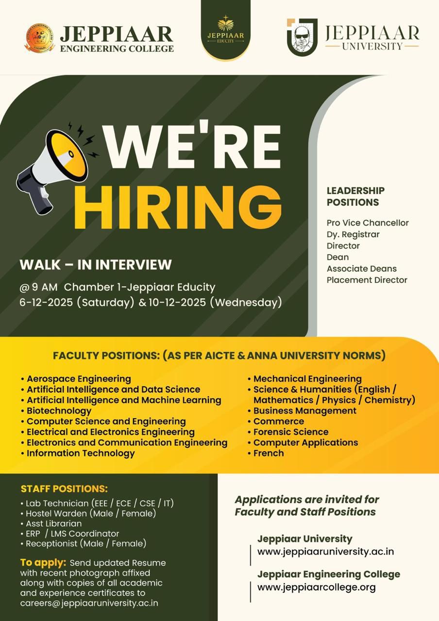 How to Apply: Interested candidates are requested to send their full updated resume with a recent photograph affixed and scanned copy of all academic and experience certificates to careers@jeppiaaruniversity.ac.in and Walk in on any convenient dates among Walk in Interview on 6th & 10th Dec 2025 (9 AM)With hard copy of the same. Bring Originals for verification. Offer letters will be provided for the selected candidates.