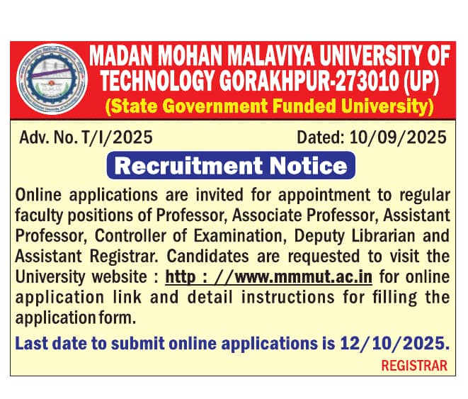 Madan Mohan Malaviya University Of Technology, Gorakhpur Advertised for the faculty recruitment 2025-2026 academic year – Teaching Faculty Jobs. Eligible candidates may apply Online