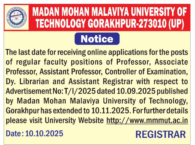 Madan Mohan Malaviya University Of Technology, Gorakhpur Advertised for the faculty recruitment 2025-2026 academic year – Teaching Faculty Jobs. Eligible candidates may apply Online