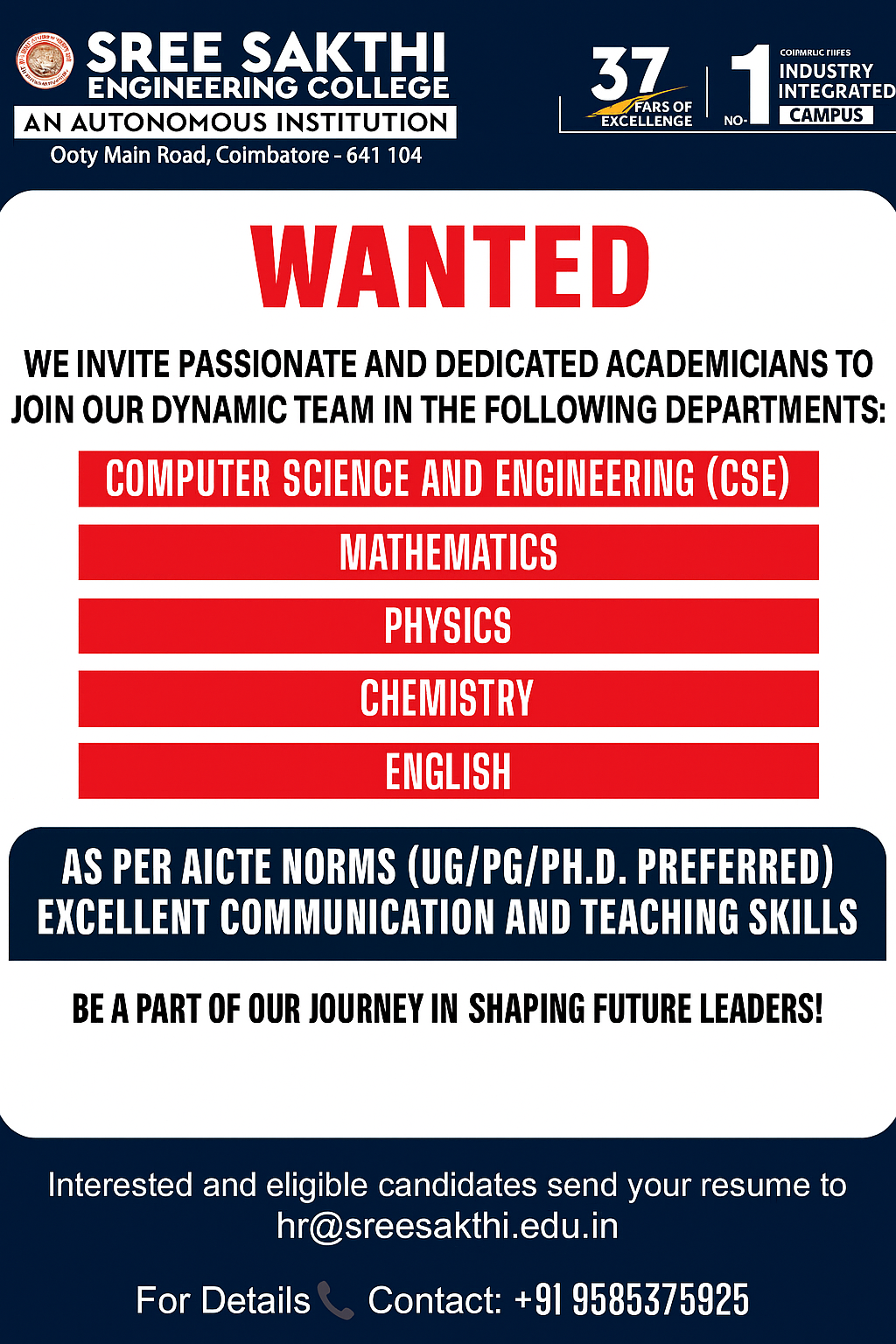 Faculty Recruitment 2025 notification announced by Sree Sakthi Engineering College, Karamadai, Coimbatore, Tamilnadu – Faculty Jobs. Eligible candidates may apply through Email.