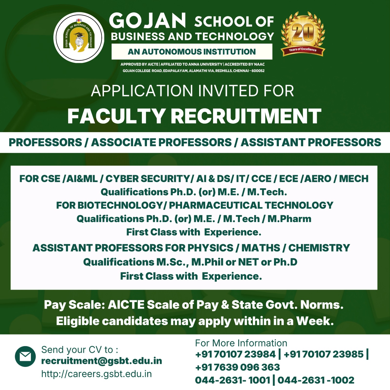Exciting faculty careers are now open at Gojan School of Business and Technology, Chennai – rewarding opportunities in Aeronautical, CSE, AI, Cyber Security, ECE, IT, Biotechnology, Robotics, and Science & Humanities. The institution invites applications for the posts of Assistant Professor, Associate Professor, and Professor. Qualified candidates with strong academic credentials and a passion for teaching are encouraged to apply through email or postal mode at the earliest.