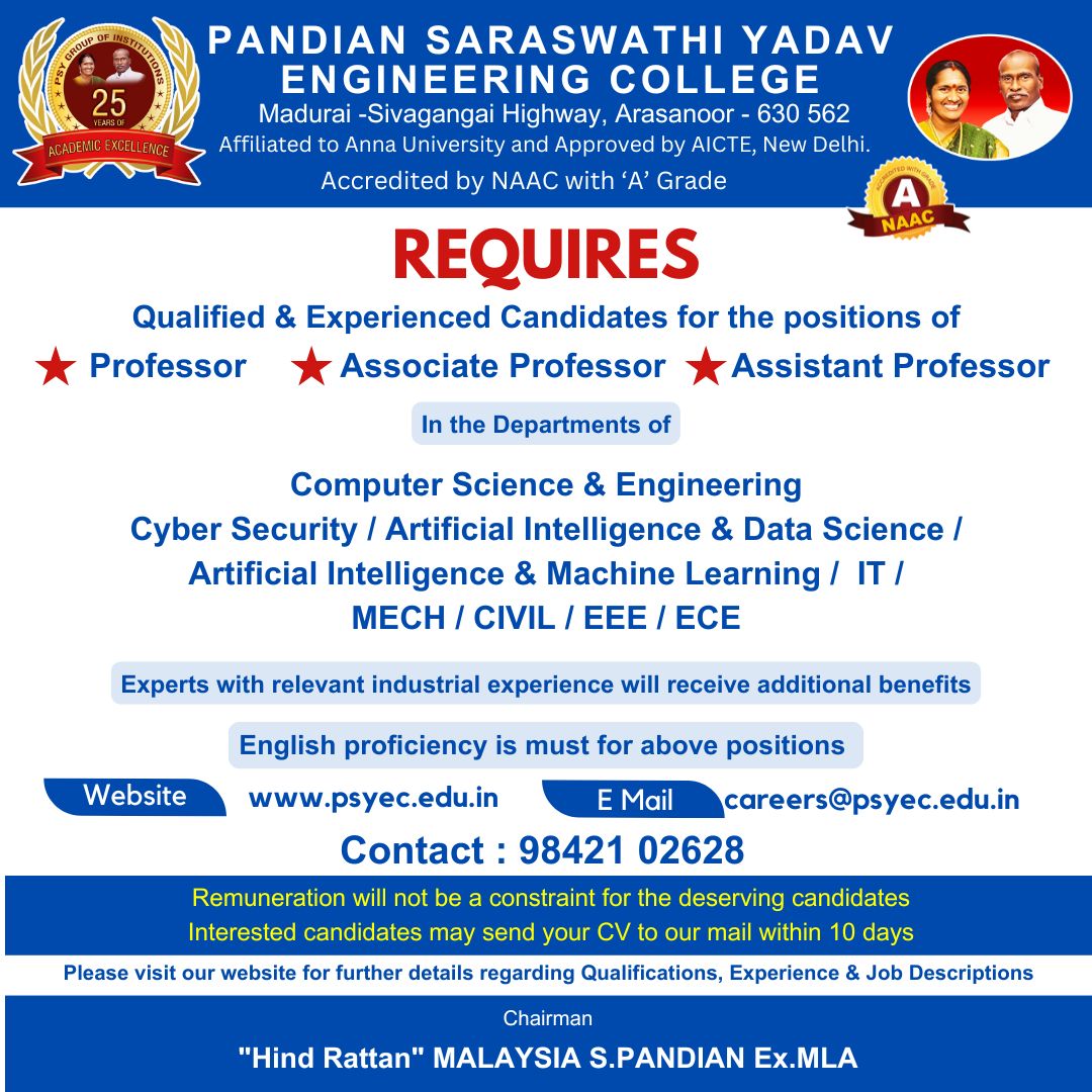 Faculty Recruitment 2026 at Pandian Saraswathi Yadav Engineering College Madurai. Professor Associate Professor Assistant Professor jobs in CSE, Cyber Security, AI and Data Science, AI and Machine Learning, IT, Mechanical, Civil, EEE, ECE.
