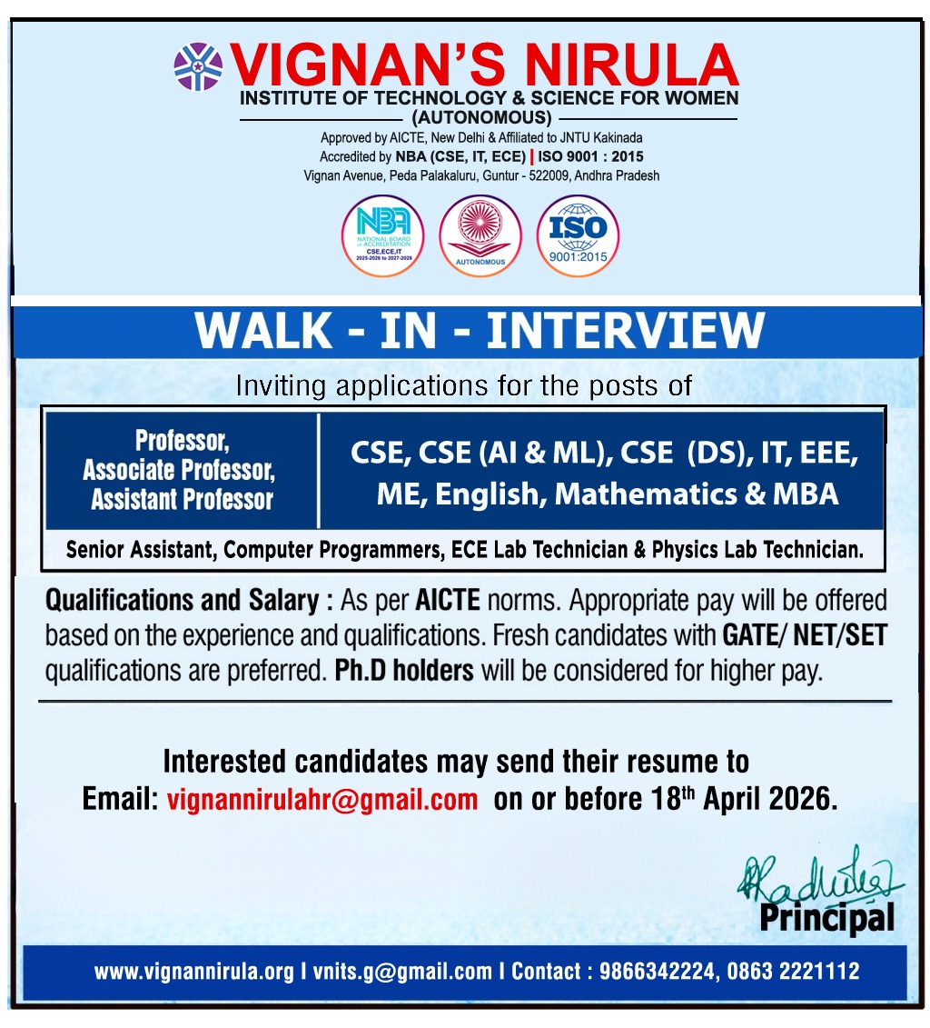 Faculty Recruitment 2026 notification has been announced by Vignan’s Nirula Institute of Technology & Science for Women, Andhra Pradesh through a walk-in interview process. The institution invites applications for Professor, Associate Professor, and Assistant Professor positions across multiple departments including CSE, AI & ML, IT, EEE, Mechanical, English, Mathematics, and MBA. This is an excellent opportunity for candidates with strong academic and research backgrounds to join a reputed autonomous institution. Eligible candidates are encouraged to attend or apply via email before the deadline.