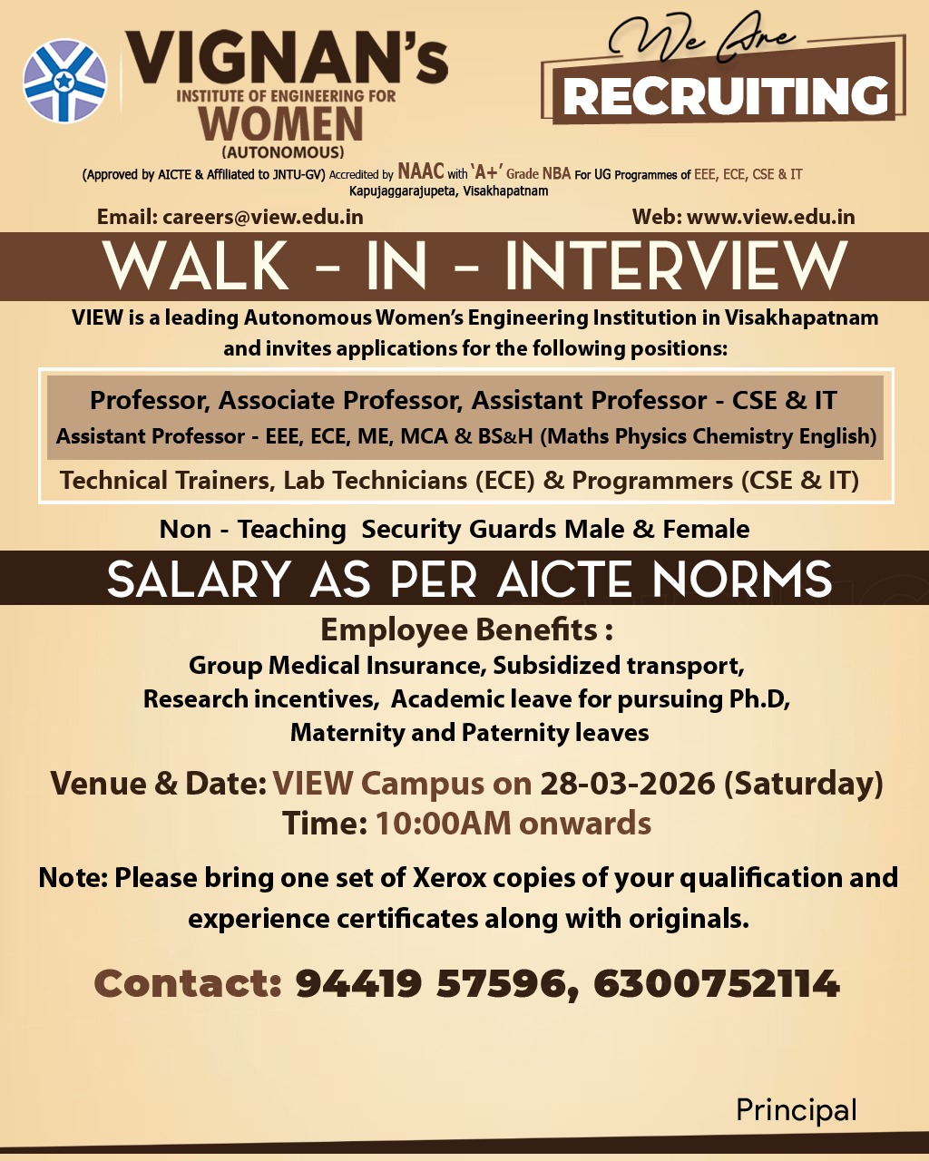 Faculty Recruitment 2026 job notification announced by VIGNAN’S Institute of Engineering for Women, Visakhapatnam, Andhra Pradesh for 2026-27 academic year. Eligible candidates may attend Walk-in interview.