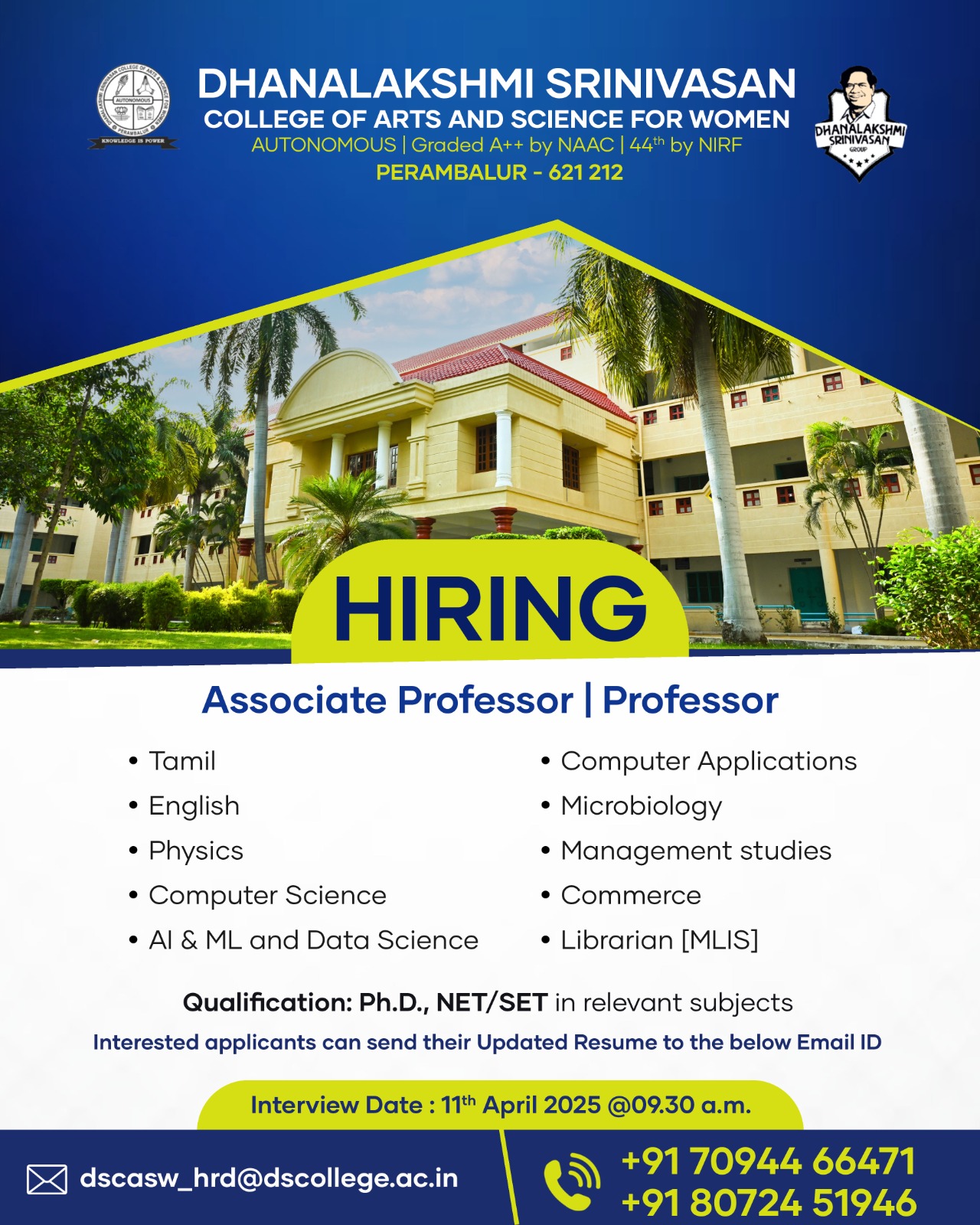 Hiring Organization: Dhanalakshmi Srinivasan College of Arts and Science for Women (Autonomous), Perambalur.