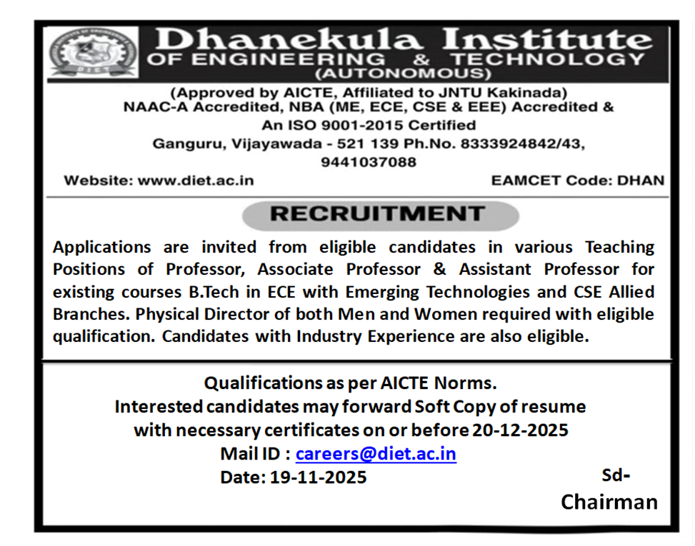 Faculty Recruitment 2025 Job notification announced by Dhanekula Institute of Engineering & Technology, Vijayawada, Andhra Pradesh for Academic Year 2025-2026. Eligible candidates may apply through Email.