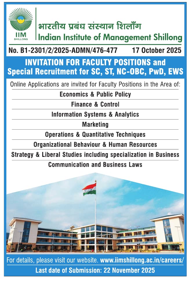 Faculty recruitment notification announced by Indian Institute of Management, Shillong, Meghalaya for the 2025-2026 academic calendar year. Eligible candidates may apply Online.