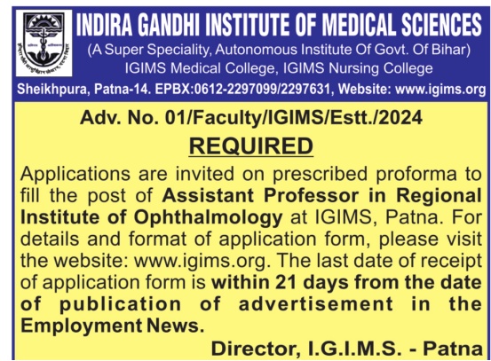 Faculty Recruitment 2024 notification announced by Indira Gandhi Institute Of Medical Sciences, Patna, Bihar – Assistant Professor Jobs. Eligible candidates may apply through Postal