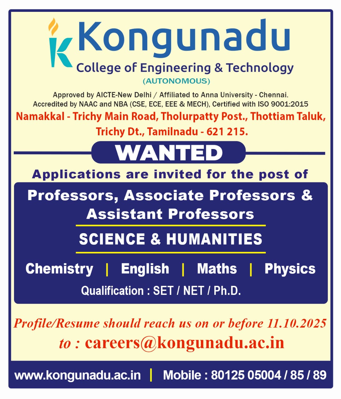 Faculty recruitment notification announced by Kongunadu College of Engineering and Technology, Trichy, Tamilnadu for the 2025-2026 academic calendar year. Eligible candidates may apply through Email.