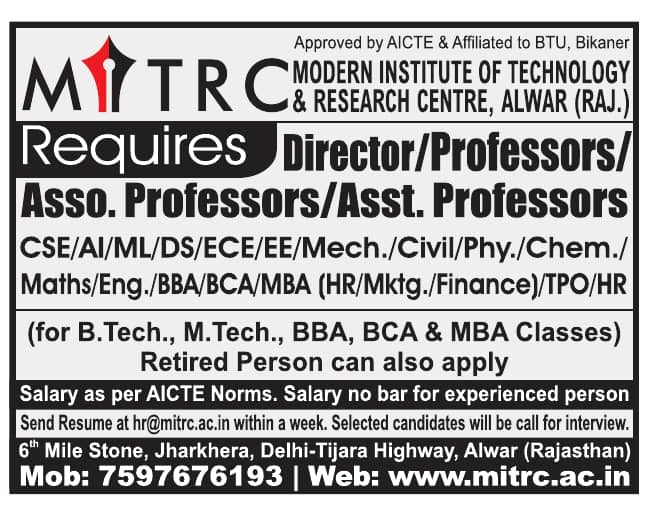 Teaching Jobs vacancy notification announced by Modern Institute of Technology and Research Centre, Alwar, Rajasthan – Director, Professor/ Associate Professor/ Assistant Professor for the 2025 academic year. Eligible candidates may apply through email within a week.