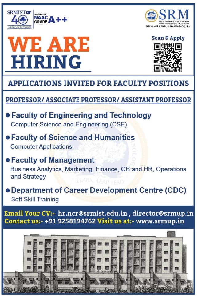 Teaching Jobs vacancy notification announced by SRM Institute of Science & Technology, Delhi NCR Campus, Ghaziabad for Professor/ Associate Professor/ Assistant Professor. Eligible candidates may Email / Online