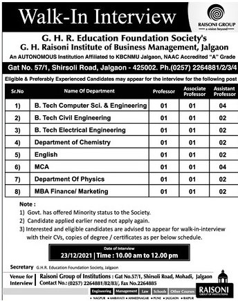 G H Raisoni Institute Of Business Management, Jalgaon Wanted Assistant Professor, Lab Assistant and Administrative Assistant