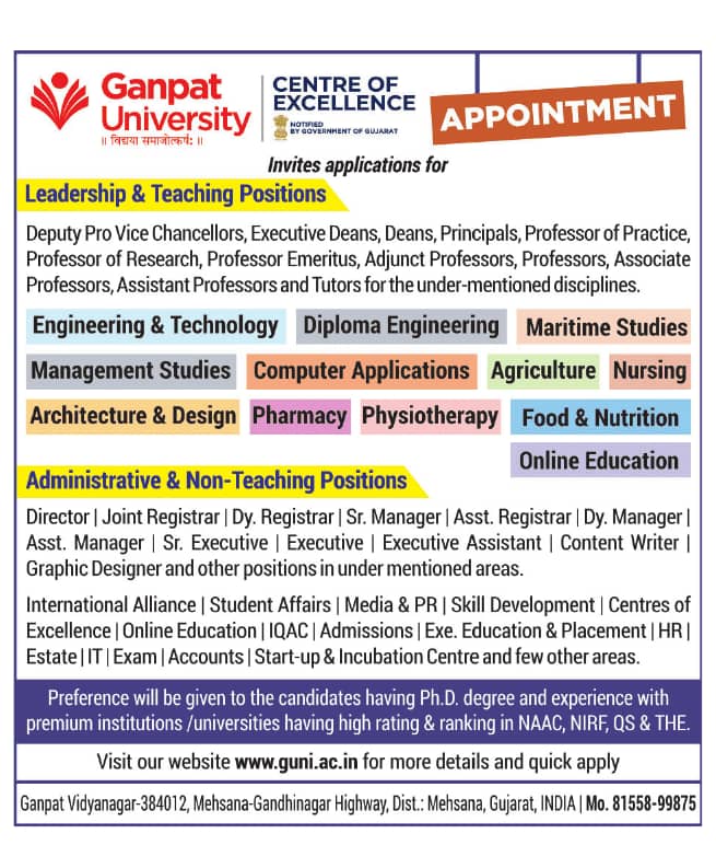 Ganpat University, Mehsana, Gujarat Wanted Professor/ Associate Professor/ Assistant Professor and Others for the Academic year 2025-2026. Eligible candidates can apply online.