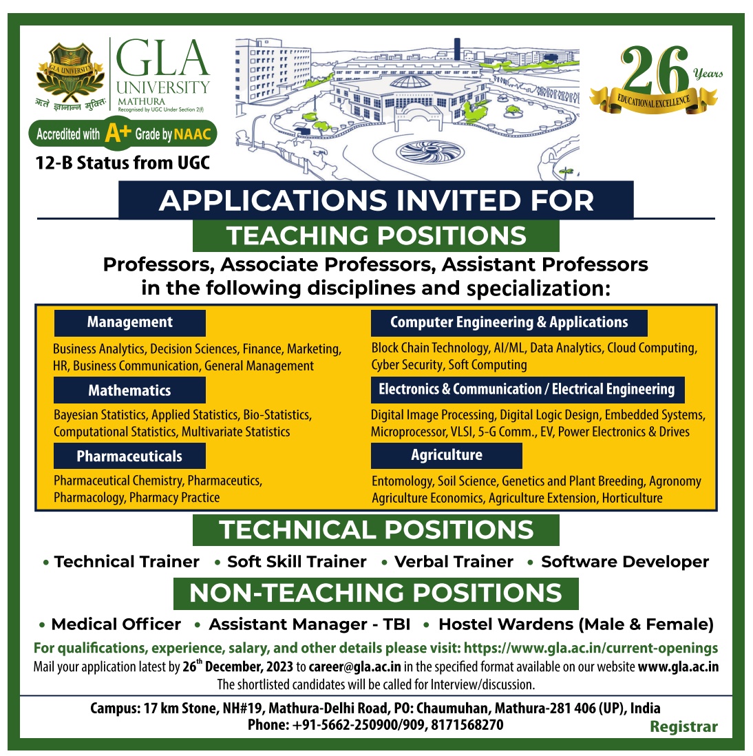 Faculty Recruitment job notification announced by GLA University, Mathura, Uttar Pradesh for the post of Professor, Associate Professor, Assistant Professor, Technical Trainer, Soft Skill Trainer, Verbal Trainer, Software Developer, Medical Officer, Assistant Manager, TBI, Hostel warden (Male & Female) Jobs. Eligible candidates may apply through Email by 26th December 2023.