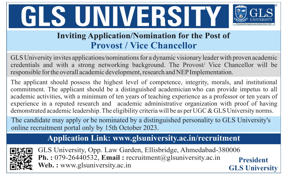 GLS University, Ahmedabad, Gujarat has announced Non-Teaching Faculty recruitment for the post of Provost/ Vice-Chancellor for the academic year 2023-2024. Eligible candidates can apply Online.