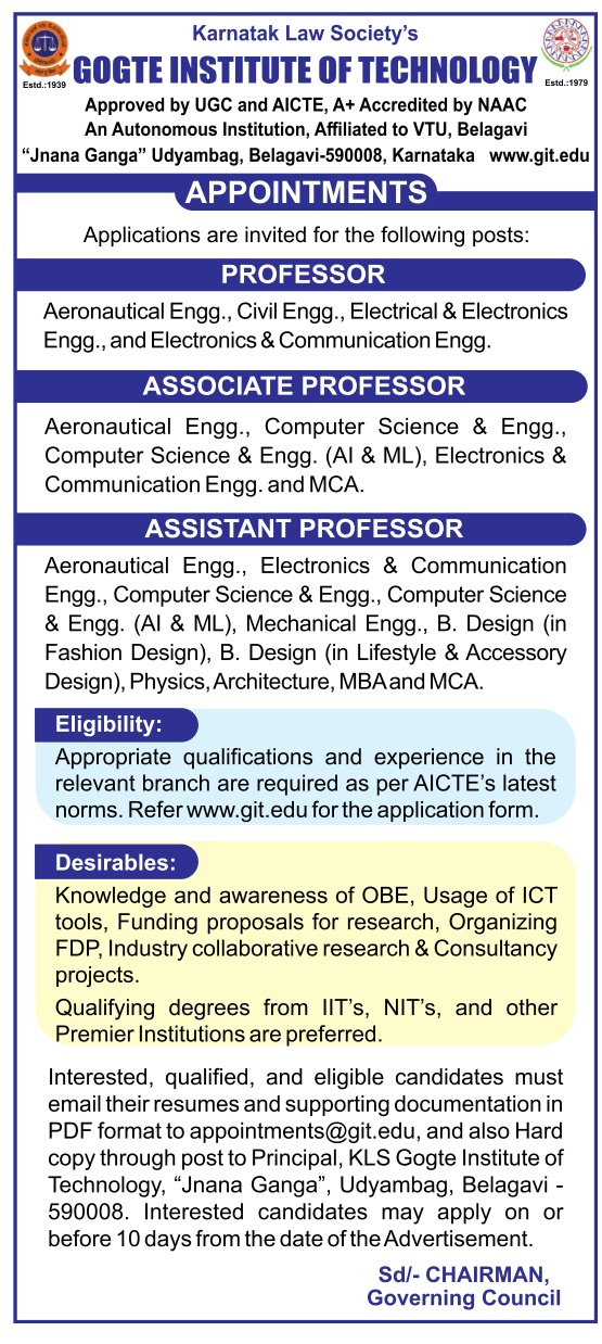 College Profile: Gogte Institute of Technology, the flagship Institute of Karnataka Law Society, Belagavi was incepted in 1979 and it is included under the section 2(f) and 12(b) of UGC act 1956, permanent affiliate and an Autonomous Institution under Visvesvaraya Technological University, Belagavi. Spread across a sprawling mango meadow of over 23 Acres, GIT, houses 07 undergraduate and 09 postgraduate disciplines including MBA and MCA programs. GIT has the honor of sheltering over 4500 students and more than 250 highly qualified and motivated workforce. Institute also carries the distinction of getting NBA Accreditation by AICTE for the third time in succession, 2004, 2008 and 2015.