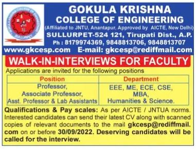 Gokula Krishna College of Engineering, Tirupati, Andhra Pradesh Advertised for the Faculty recruitment 2022 – Professor, Associate Professor, Assistant Professor Jobs. For More Details see below.