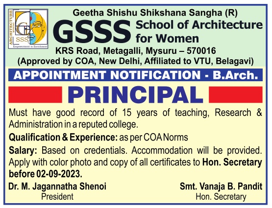 Faculty recruitment 2023 Job vacancy notification announced by GSSS School of Architecture for Women, Mysuru – Principal Jobs for the 2023 academic year. Eligible candidates may apply by post within 2nd September 2023.
