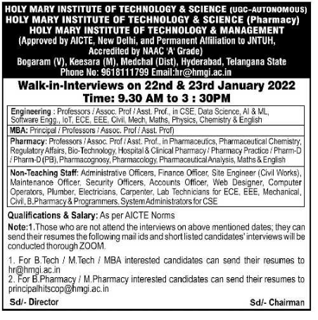 Faculty Recruitment job notification announced by Holy Mary Institute of Technology and Science (Engineering, Pharmacy, Management), Hyderabad for the Post of Professor/ Associate Professor/ Assistant Professor . Eligible candidates may Walk-In
