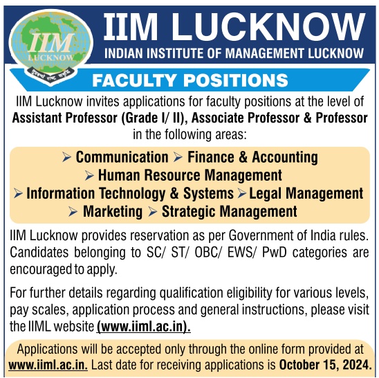 Faculty recruitment job notification announced by IIM Lucknow, Uttar Pradesh for Professor/ Associate Professor/ Assistant Professor (Grade I & II) Jobs. Eligible candidates may apply Online.