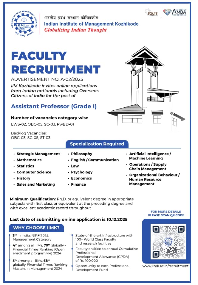 Faculty Recruitment notification announced by the Indian Institute of Management Kozhikode, Kerala – Assistant Professor. Eligible candidates may apply online