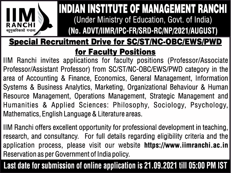 Indian Institute of Management , Ranchi wanted Teaching Faculty