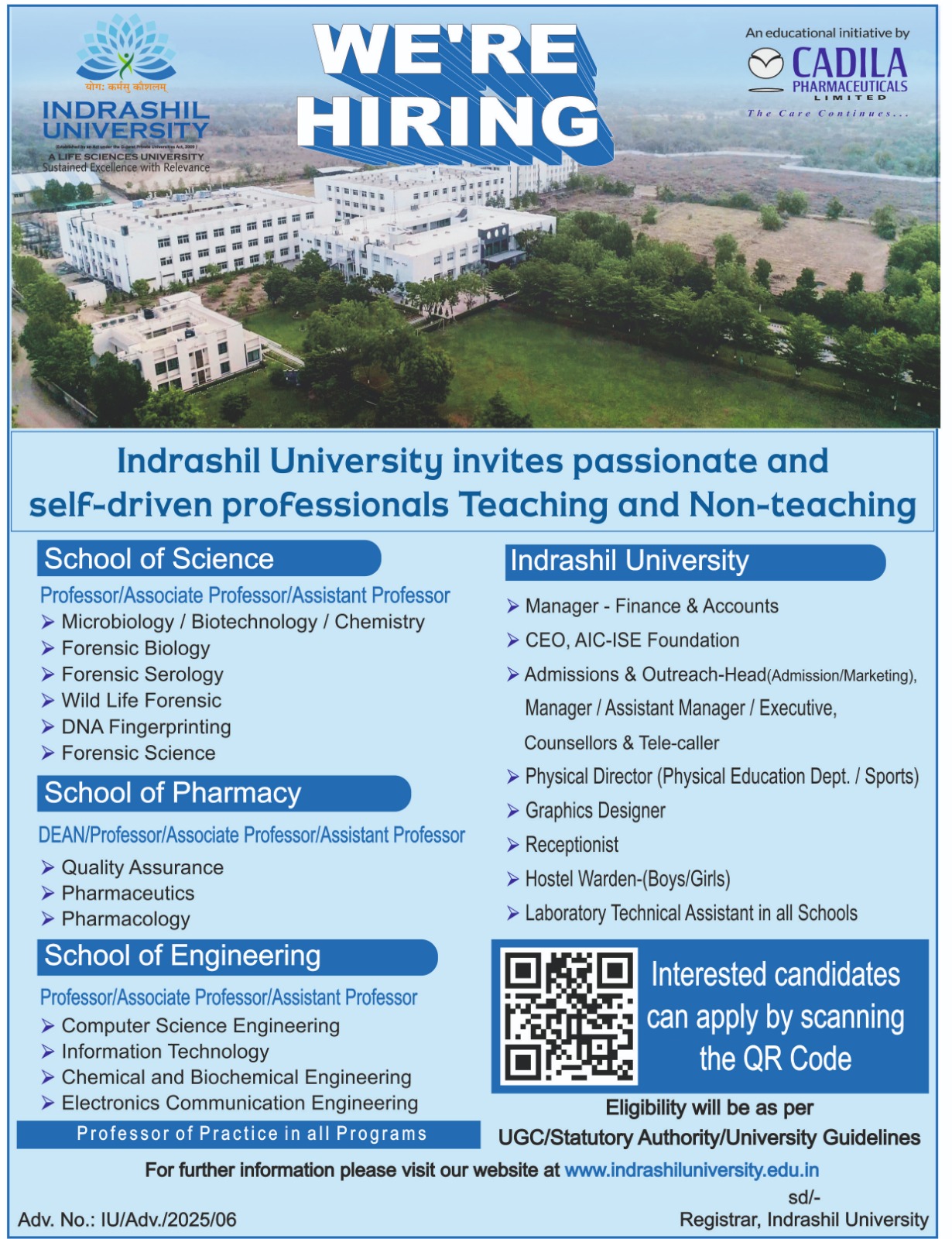 Faculty Recruitment 2025 notification announced by Indrashil University, Mehsana, Gujarat. Eligible candidates may apply by Email.
