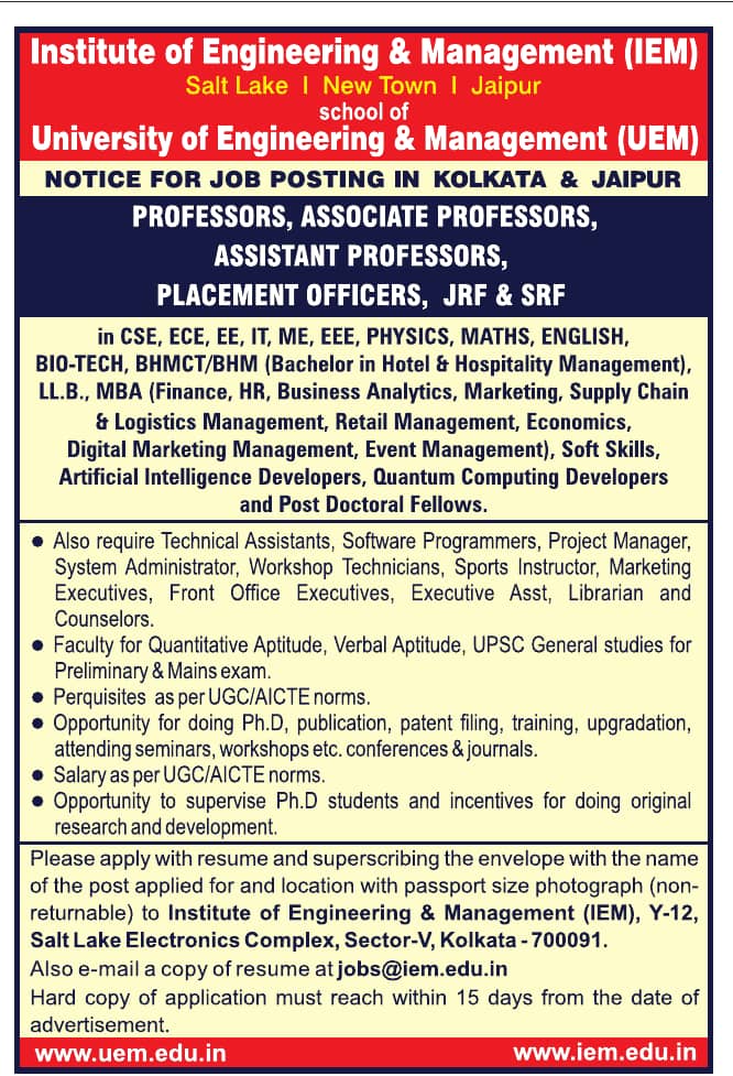 How to Apply: Please apply with resume and superscribing the envelope with the name of the post applied for and location with passport size photograph (non-returnable) to Institute of Engineering & Management (IEM), Y-12, Salt Lake Electronics Complex, Sector-V, Kolkata – 700091. Also e-mail a copy of resume at [email protected] Hard copy of application must reach within 15 days from the date of advertisement.
