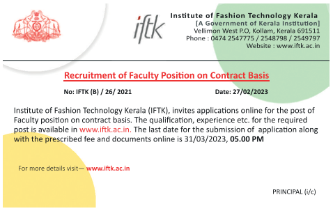 Institute of Fashion Technology Kerala, Kerala Wanted Faculty on Contract basis