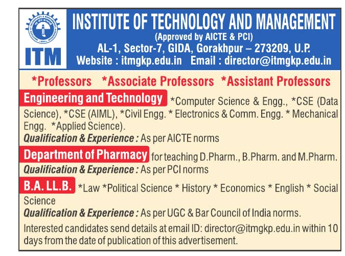 Institute of Technology and Management, Gorakhpur is inviting applications for Assistant Professor/Associate Professor/Professor for 2025-2026 academic calander year. Interested candidates may apply through Email
