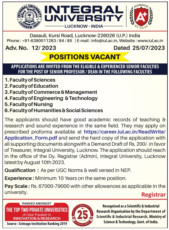 Faculty Recruitment vacancy notification announced by Integral University, Lucknow – Senior Profesor/ Dean Jobs for the 2023-2024 academic calendar year. Eligible candidates may apply online and Postal.