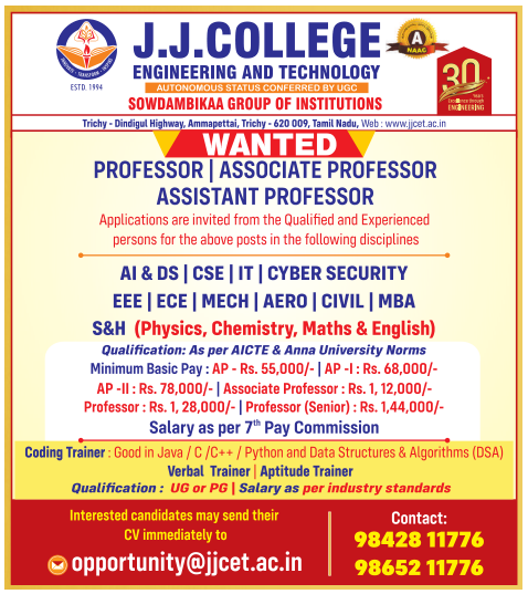 Faculty Recruitment 2025 job notification announced by J.J. College of Engineering and Technology, Trichy Tamil Nadu for the 2025-2026 academic year. Eligible candidates may apply through Email