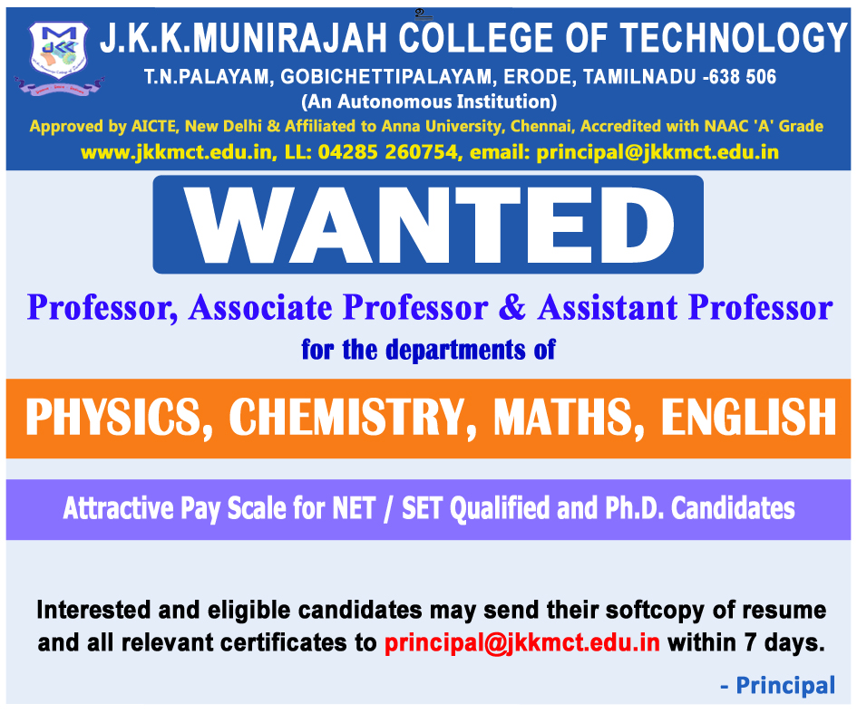 Faculty Recruitment 2026 notification announced by J.K.K. Munirajah College of Technology, Erode, Tamilnadu- Assistant Professor/Associate Professor/Professor and Lab Assistant Jobs. Eligible candidates may apply through E-Mail.