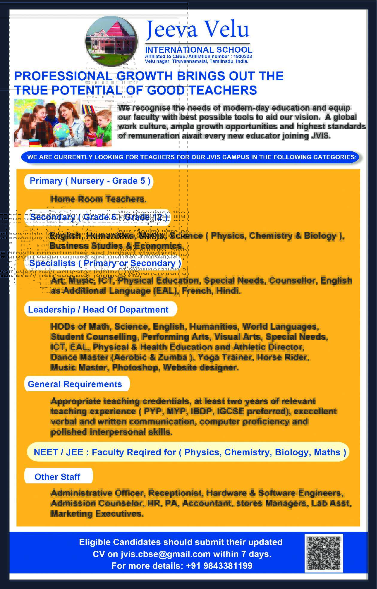Faculty Recruitment job notification announced by Jeeva Velu International School, Tiruvannamalai, for the post of Primary, Secondary, HOD Jobs. Eligible candidates may apply as soon as possible.
